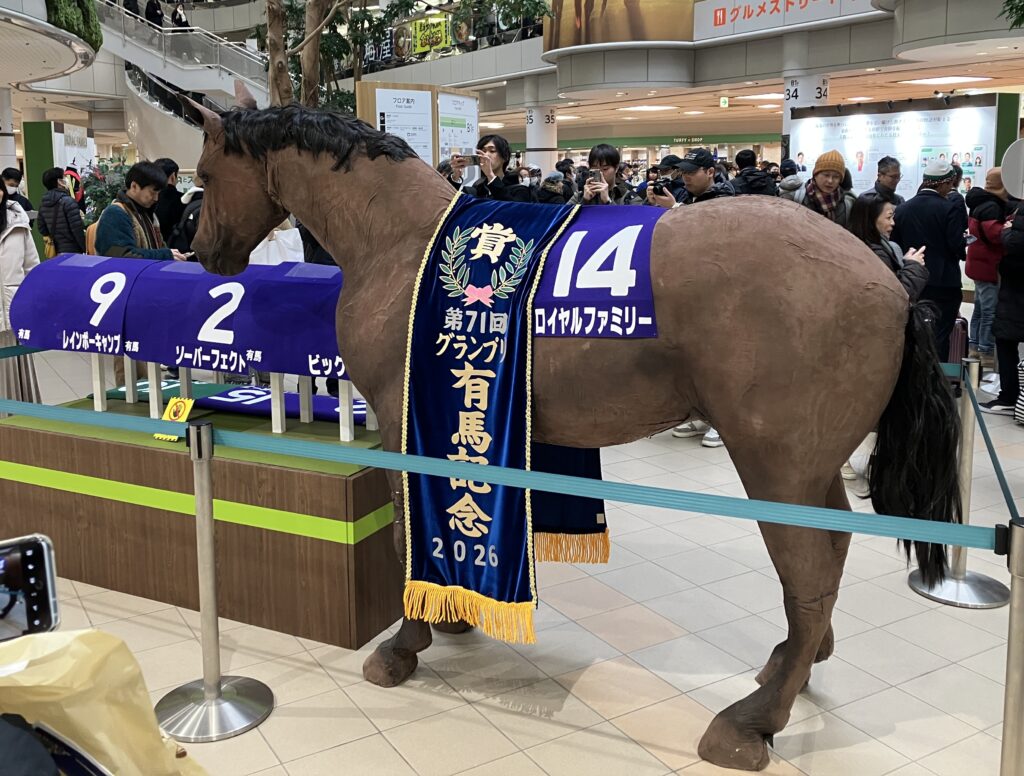 会場に着いてまず目に飛び込んできたのは、首に「第71回グランプリ有馬記念2026」の優勝レイがかけられた大きなロイヤルファミリー像。